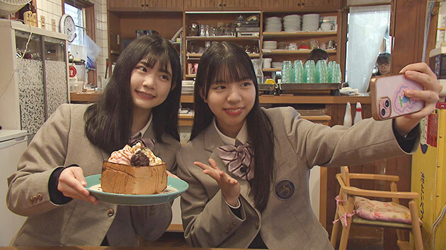 また、長年地元で愛されてきた松本市の「カフェレストガレージ」が登場。春先取り!桜を使った〝食パンデザートスイーツ〟を竹内花春さん(はるにゃん)と高柳咲彩さん(さやぴ)が楽しみました。木をふんだんに使ったぬくもりある空間で、つい長居したくなるフレンドリーな店内の雰囲気。ついつい2人で話が進んで、高校生らしい思い出話に花が咲きました。